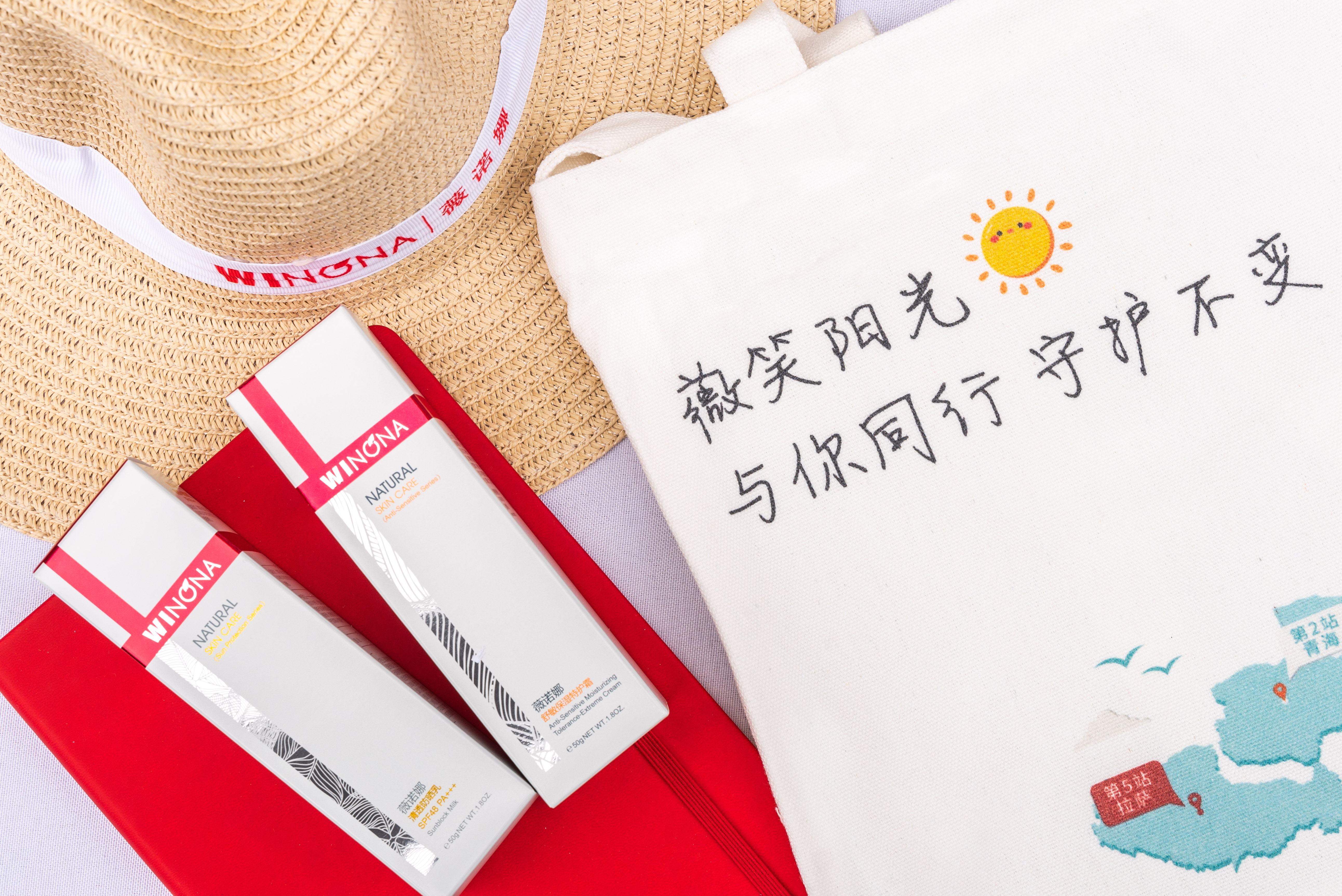 在包含50G舒敏保湿特护霜、50G清透防晒乳、有防晒知识彩页的限量定制高端笔记本、定制巴拿马草帽与帆布袋的防晒礼包中,薇诺娜将品牌力倾注其中。